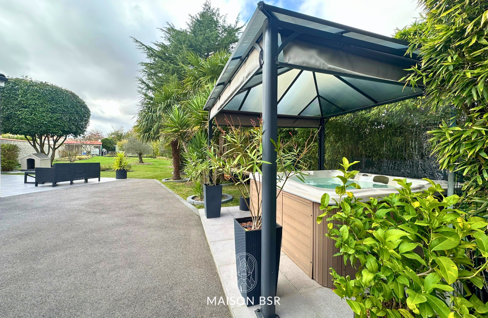 Profitez d'un jardin paysager de 1256 m2 clos et arboré , avec terrasse bien exposée, jacuzzi , grand garage de 40 m2 attenant à la maison et deux dépendances de 20 m2.